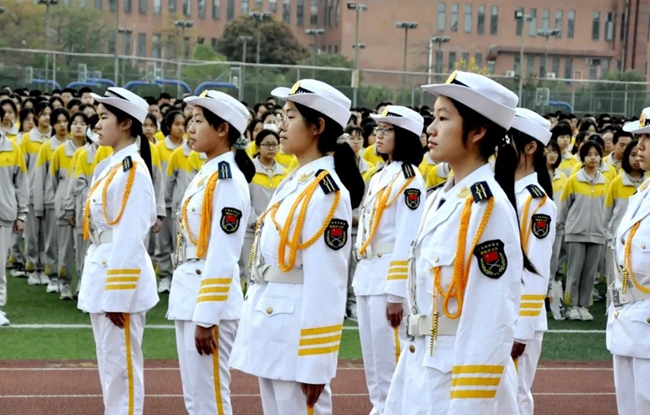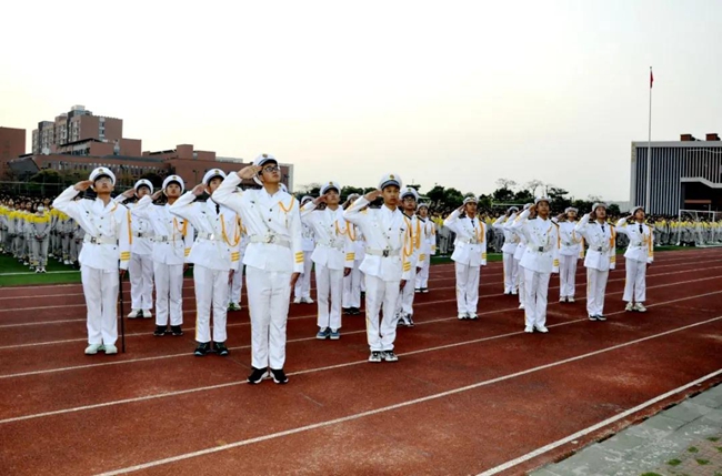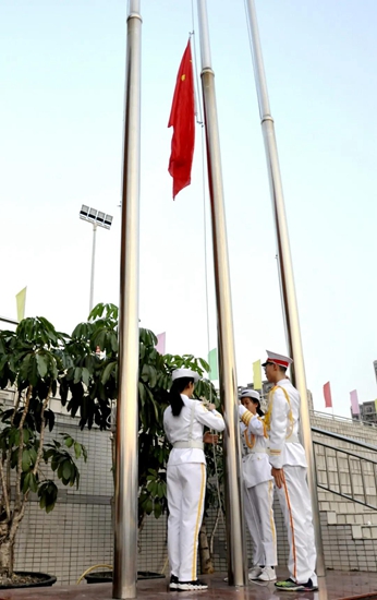 护旗手们高视阔步中洋溢着朝气十足的自信神采,在全体师生的注视中,将手中鲜艳夺目的国旗拴于旗杆上,五星红旗在被如火朝阳渲染的晨色中冉冉升起,在广阔天空中绽放飞扬。