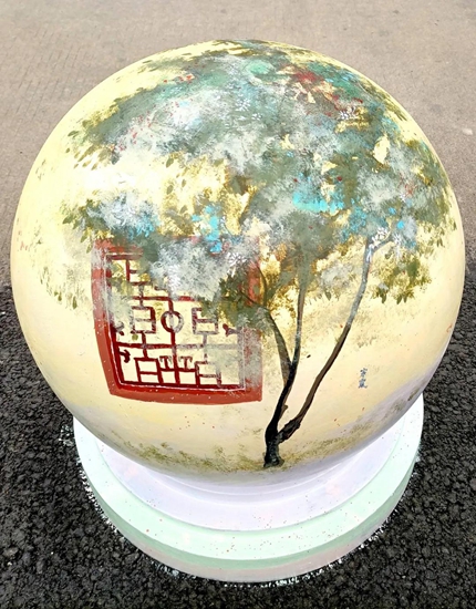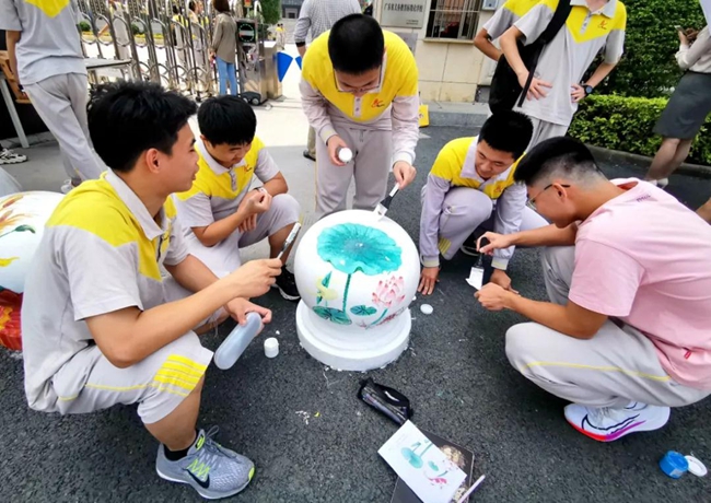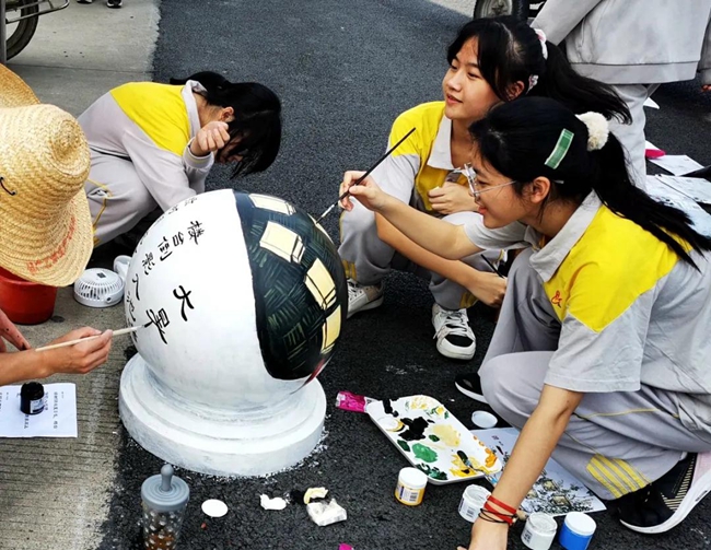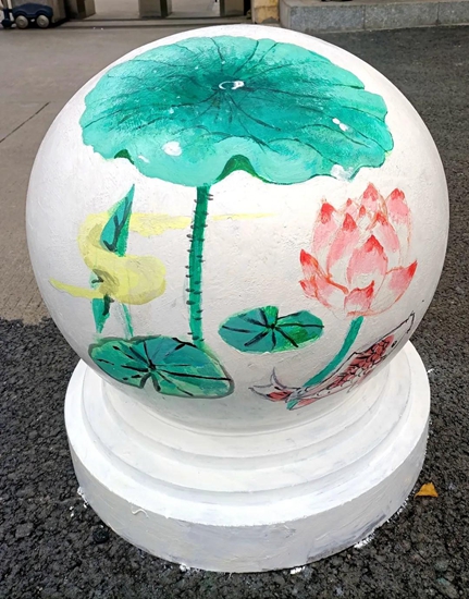 导师们的号召得到“学生画师”们迅速响应,沾上柔和颜料的画刷为石墩们抹去暗哑尘灰,流畅有致的粗细线条在石墩表面组合出美妙的图案,涂上亮眼色彩的画笔在一双双的巧手中注入了生动灵魂,笨重的石球们彷如被施以神奇魔法,在学生们的帮助下“脱胎换肤”。