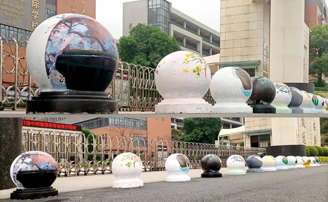 广州市黄广中学校门处,一群热爱艺术创作的“学生画师”们,把眼光瞄准了校园大门前的一座座小石墩,带上了他们的“精锐武器”——画笔与颜料,肆意发挥缤纷多彩的奇思妙想,为眼前“灰头土脸”的笨重石球们来一场“亮眼大变身”。