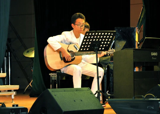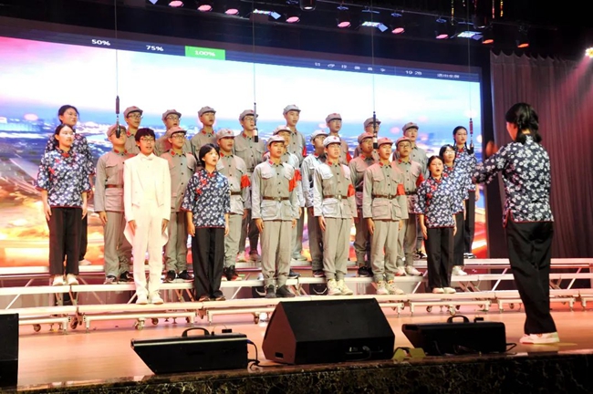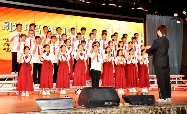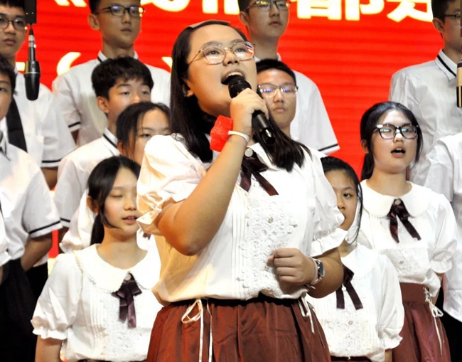 师生们以歌唱怀,阳光向上的精神面貌、斗志饱满的动人歌声无不让英达舞台上的每一瞬间充满着爱国爱党热情、浸染着家国情怀色彩;
