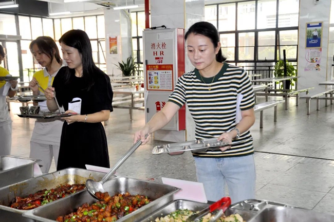 范小星执行校长、孙传华副校长、杨文化副校长、叶成林校助等联合教师代表、初高中学生会代表、后勤部门代表等组成本次比赛评委团,现场眼观、鼻闻、品尝,再根据味道、色泽、营养搭配、制作烹饪难度等多方面进行考核评分。