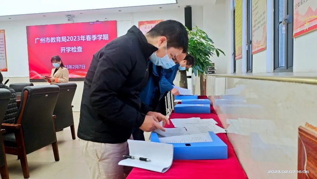2月7日,广州市教育局第九督查督办组组长/市管一级调研员赵琼飞率队检查指导黄广中学开学工作。