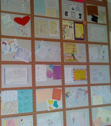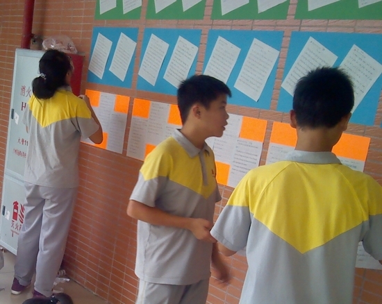 从第6周至第8周,七年级英语组的老师们在组长Rainy的带领下,由陈晓东老师和杨清老师直接牵头筹划和组织了这期英语书法和彩报汇展。活动当中,李慧兰、陈红荣、吴泽、郭璐、赵爽和张金蕊等老师们积极协调,精选学生们的优秀作品。 首先要求学生全员参与英语书法撰写,加强指导,再从各班挑选优秀的作品,集中在校园“明星墙”展示。英语彩报更是精彩倍出,不缺妙笔生花之作。内容主要是通过描绘妈妈一天里的工作进程,让学生们详细了解母亲工作之辛劳、生活之艰辛、关爱之深切。在挑选参展作品时着实让老师们费劲了心思,很难取舍,很多作品因为展出版面有限不能一一展示,也只能在各自的班级里“秀”了。 这次七年级英语书法和彩报汇展,是在陈明星校长、蒋晓明校长助理等领导的关怀和支持下进行的。活动大大促进了七年级的英语教学工作,不仅使七年级的学生们深受启发,而且高年级的学生们也赞不绝口,并不断吸引着更多的学生参与其中。