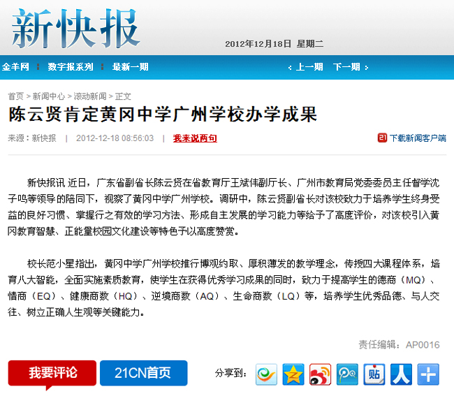 媒体报道:陈云贤肯定广州市黄广中学办学成果