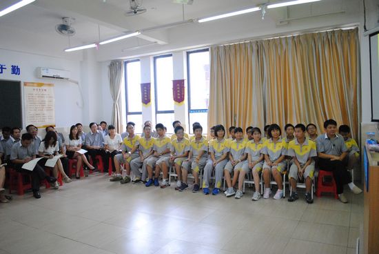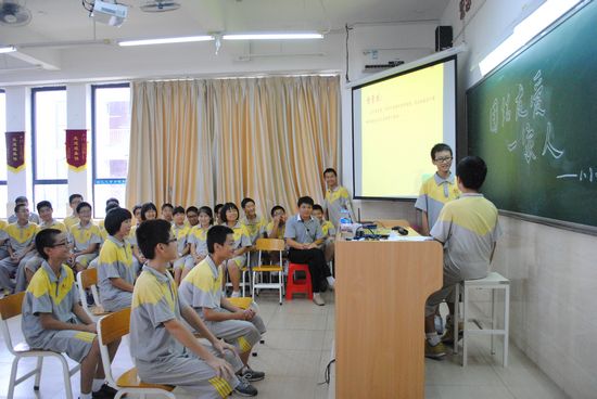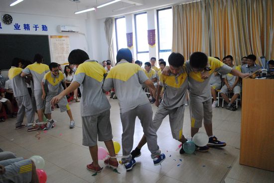 9月26日下午第一节课,我们八(8)班上了一节以“团结友爱一家人”为主题的班会公开课。整节课由我班的主持人王苏粤、刘派、谭心弦、李昊年主持。校领导、班主任以及任课老师等三十多人来参加了我们的班会。 上课铃一打响,班主任朱老师首先上台,在轻松的音乐声中,将一双筷子轻而易举地折断了,而后又尝试把一大把筷子折断,结果没能成功,用简明生动的例子阐述了“团结就是力量”这个道理,引出了今天班会的主题。 为了让大家更深刻地体会到团结的力量,我们开展了一个两人三足版的踩气球游戏:两个人一组,在内侧腿上绑五个气球,参赛者要在保护自己气球的情况下踩爆对方的气球,最后所剩气球最多的一组获胜。游戏进行得很激烈,同学们都在为场上的参赛者呐喊助威。在紧张的比拼过后,吴铠岚和张玮琦同学以绝对优势赢得了这场比赛。 游戏过后,大家一起欣赏了由关昊中等同学倾情演绎的情景剧《值日》。小品讲述了在一次大会上,我们班被主任点名批评卫生差。由于刚开学,同学们对待值日也很漫不经心,与劳动委员发生了争执。当天晚上,值日生们又聚在一起谈了话,意识到了班级荣誉感和团结的重要性,在不懈努力之后,获得了主任表扬的故事。 随后,一首《众人划桨开大船》的合唱将整场班会推向了高潮。我们这一家人手拉着手唱响了这支激情澎湃的团结之歌,同学们的声音充满了力量,深深地感动了在场的领导和老师,也更坚定了我们41颗团结友爱的心。 班会的最后,我班41名同学庄严宣誓,为班级荣誉而努力,为班级团结而奋斗!就这样,带着同样的信念,同样的梦想,我们齐步向充满光明的未来踏进…… 在一片热烈的掌声中,我班“团结友爱一家人”的主题班会圆满地划上了句号。八(8)班41名学子构建了比血缘关系更加亲密的大家庭。同学们手拉着手,肩并着肩,目送着老师们离去。