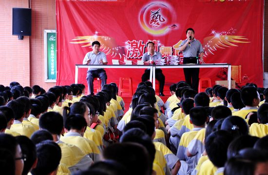 6月6日下午,我校七年级师生600多人齐聚一栋教学楼一层,举行七年级教学表彰暨期末考试动员大会。会议由学校教务处主任蒋晓明主持,陈明星副校长、年级朱迎春主任分别发言。 朱迎春主任回顾了近一年来七年级所取得的成绩,并重申学校将拿出400多万元重奖品德优秀且两学期期末成绩综合排名前50℅的学生,以此激励学生刻苦学习、力争上游。 两名优秀学生代表发言,介绍自己的学习方法和备考经验。随后的颁奖仪式将会以推向高潮。蒋晓明主任宣布受表彰的学生名单,其中包括五月月考前100名的学生和华罗庚杯比赛获得一、二、三等奖的46名学生。随着一个个名字被宣布出来,全场掌声不断,经久不息。获奖学生高兴地与学校领导合影留念。 最后,陈明星副校长满怀深情地说:同学们,“行百里者半九十”,近一个学期以来,我们虽然取得了许许多多的成绩,我们虽然都竭尽全力地付出过,但不到期末考试最后一科结束的铃声响起,我们就不会停下探索的脚步。