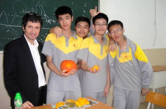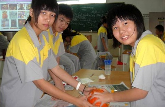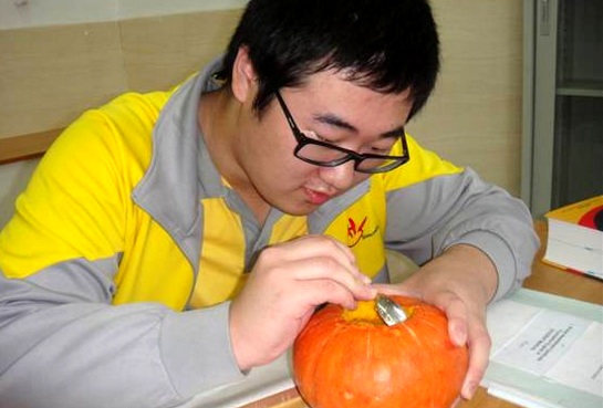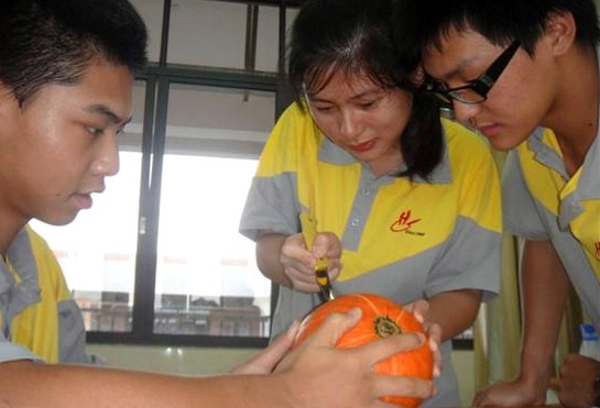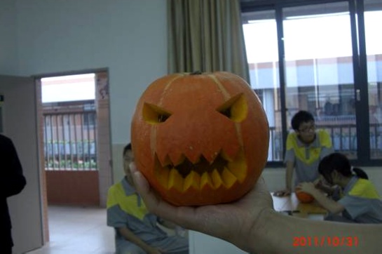 2011年10月31日,广州市黄广中学生,在来自加拿大的外籍教师Matt的指导下,于第八、九课进行了一次以万圣节为主题的实践活动。同学们被分成六组,每个小组都获得一个南瓜,目标是“Change the pumpkin into a Jack-O'-Lantern with your imagination”. 南瓜一到手,大家就开始忙乎起来。专注的眼神,细心地雕刻,超凡的想象力,紧密的合作,让原本平凡无奇的南瓜顿时生动起来:呲牙咧嘴的大笑;尖锐的眼睛;情意浓浓的爱心;有趣的是有的同学还做出了各种各样的囧态…… 这次小小的活动见证了国际班同学丰富多彩双语课程的开设效果,增强了同学们的动手能力。我们发现,平常不显山露水的同学,却在活动中展现了多才多艺的一面。 等待同学们的下一个挑战是什么呢?敬请关注校园网关于国际部的后续报道。