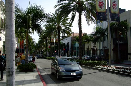 罗迪欧大道(RODEO DRIVE),是美国西海岸最昂贵的大街。这里你能找到世界各种顶级名牌和奢侈品店,每家店的装修和布置都像充满着艺术气息,独特精致,别具匠心,竭尽全力用它们高贵优雅的气质来吸引非富即贵又懂得欣赏的客人。整条街静静地沐浴在加州的暖阳里,弥漫着一种时尚的香水味,只是漫步目的地行走,仿佛也是一种美的享受。罗迪欧大道处处施展着她迷人的魅力,仿佛循循善诱着人们一种积极向上的生活态度,只要肯奋斗,罗迪欧大道的百万华服都是你触手可及的美梦。